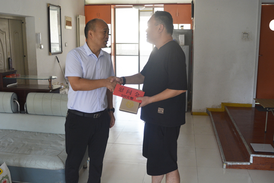 慰问中,袁玉同同志与家属亲切交谈,详细询问生活状况,转达组织的关怀与敬意,并郑重将纪念章、慰问金和慰问品递交到家属手中。